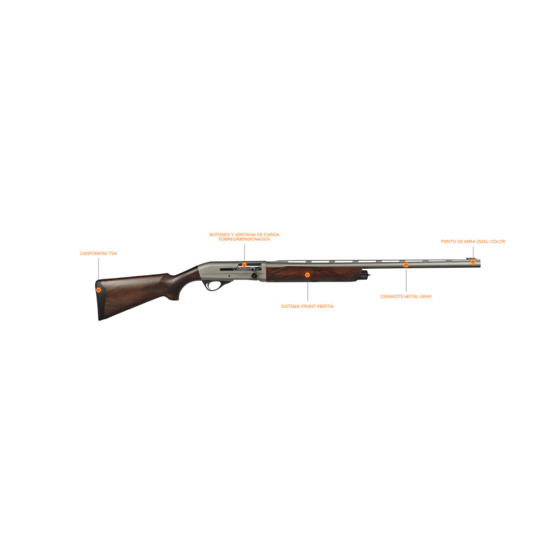La culata y el guardamanos son de madera Grado 2 con acabado al aceite. Esta escopeta de caza con cañón liso está disponible en el calibre 12 y 20. Cañón y carcasa están recubiertos con un acabado en Cerakote, en este modelo tienen el color glamour Metal Gray, que aumenta la duración y la resistencia a los fenómenos de corrosión y ofrece óptimos niveles de adhesión. Una semi-automática para todos aquellos que aman cazar con una escopeta resistente, pero que no renuncian a la culata de madera. El punto de mira de fibra óptica dual color garantiza una puntería segura y rápida incluso en condiciones de poca visibilidad.El botón de accionamiento elevador, maneta y ventana de carga son tres milímetros más grandes con respecto al estándar y, como las otras escopetas semiautomáticas de caza Franchi, está equipada con el sistema de funcionamiento mecánico Front-Inertia.